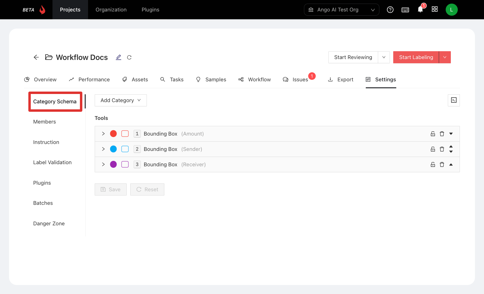 Ango Hub allows project owners to set the project’s ontology directly from the *Category Schema* section of the *Settings* page.