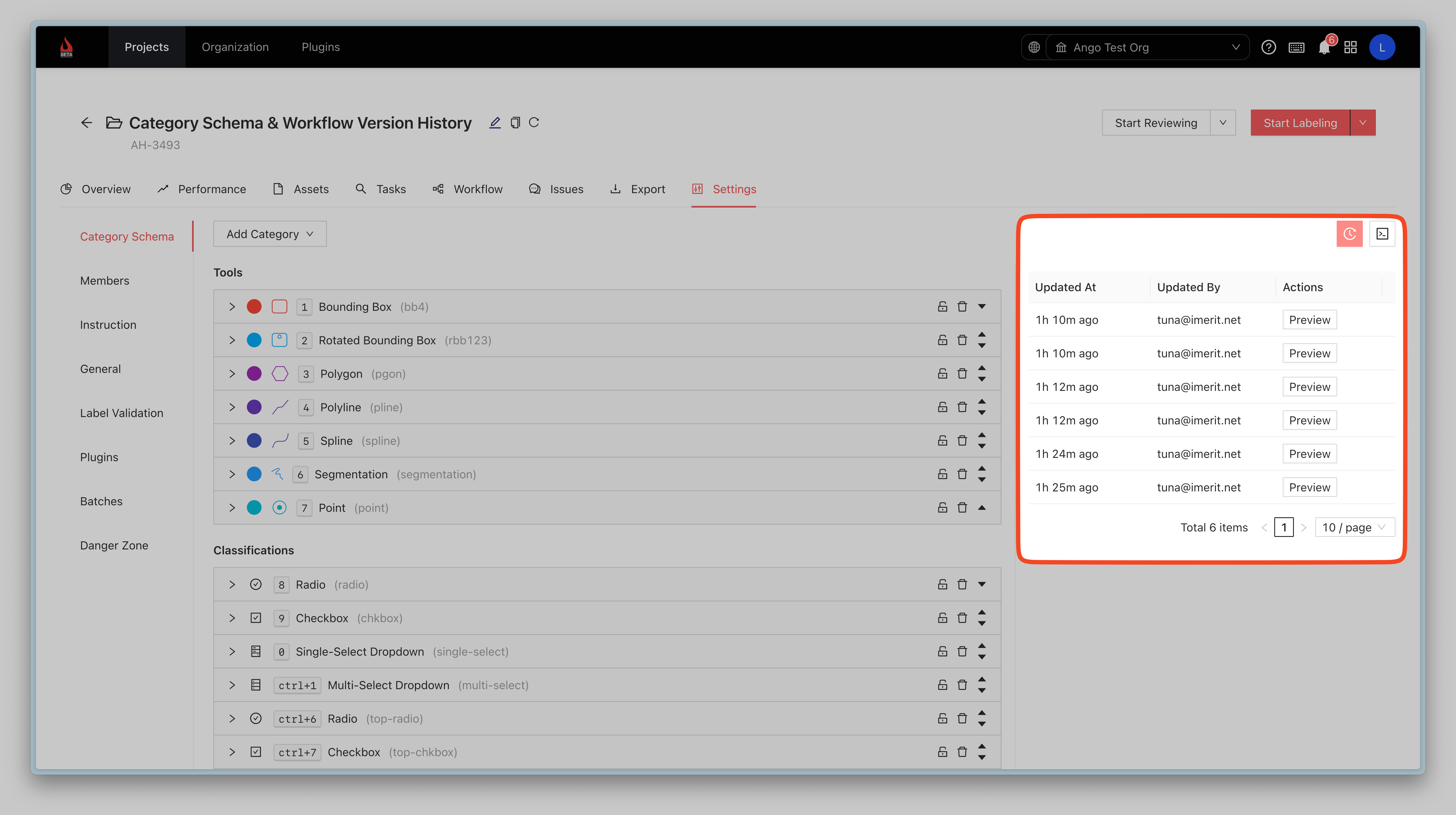 From the Settings tab, in the *Category Schema* section, click on the "History" icon on the top-right to open a history of all workflow versions in the current project.