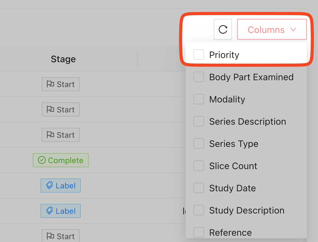 From the *Tasks* tab, click on the *Columns* dropdown, then enable the *Priority* column: