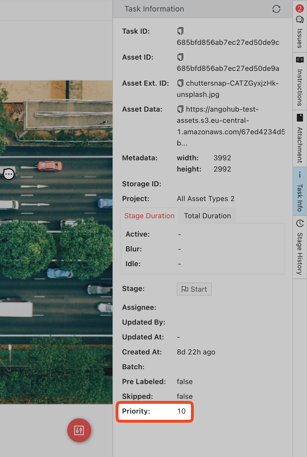 With a task open in any labeling editor, click on the *Task Info* button on the right to open the panel containing that task's priority level: