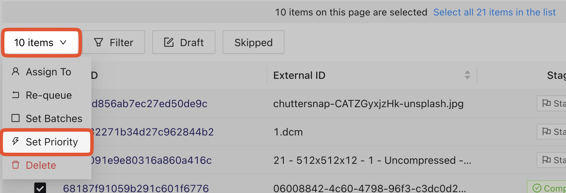 Click on the *\[Number] Items* dropdown, and then on the *Set Priority* button.