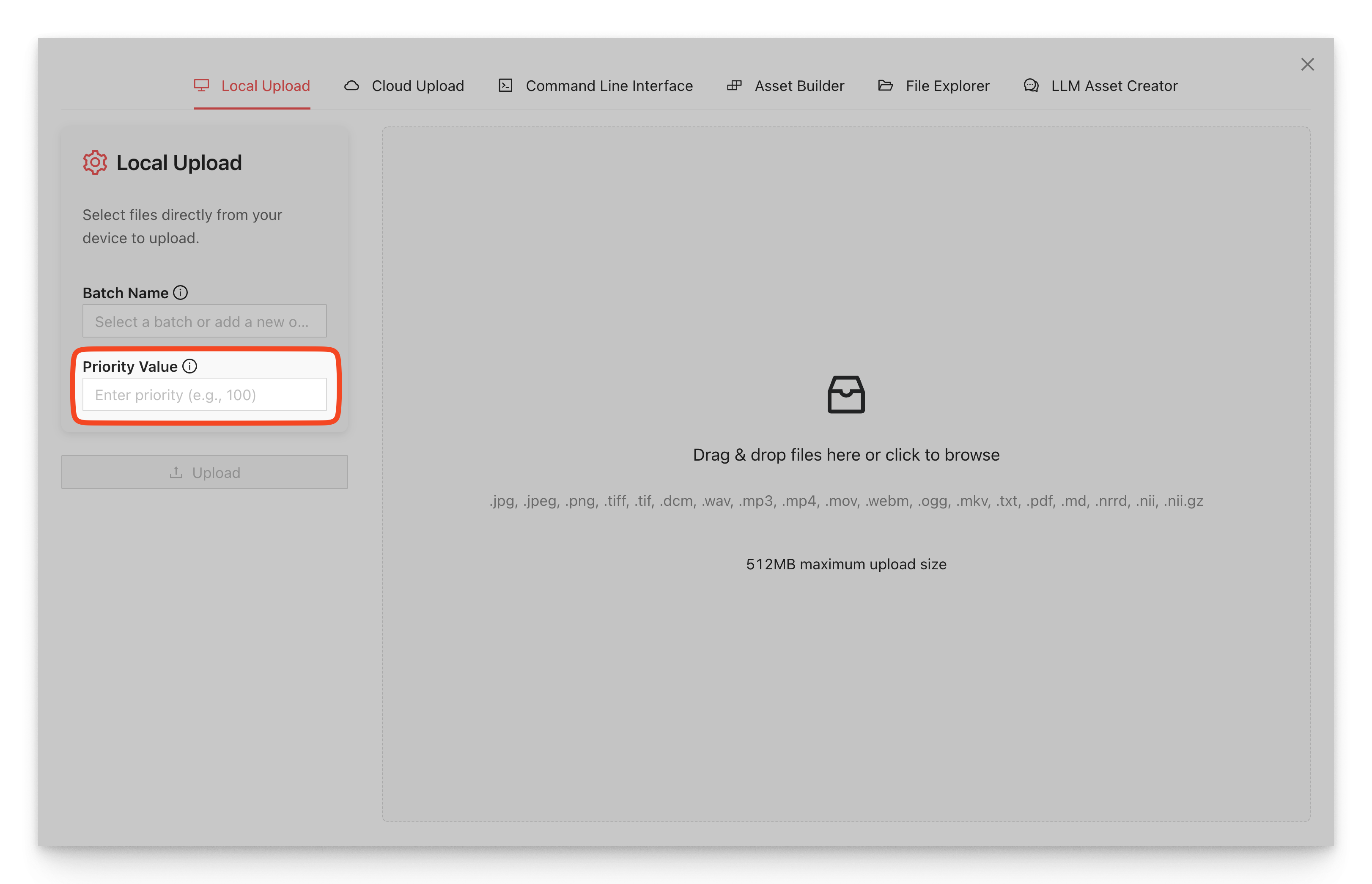 When importing assets using the Cloud Upload JSON method, you may add a `priority` key-value pair to each task to assign a priority level to that task.