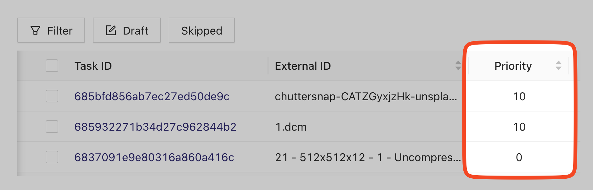 Project managers may assign granular priority levels to tasks in their projects. Tasks with higher priority levels will be shown to users (labelers/reviewers) before tasks with lower priority levels.