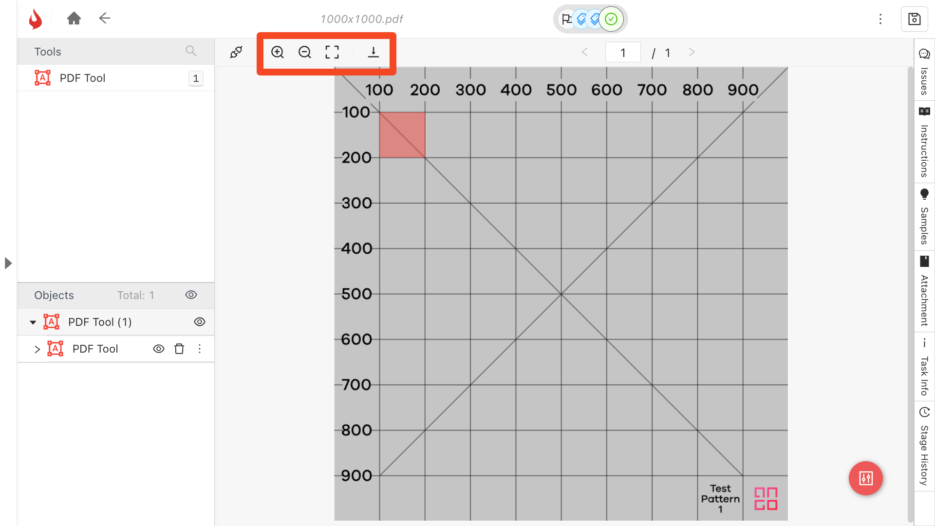 With the + and - zoom buttons you can adjust the PDF's zoom level. <img src="https://3895963154-files.gitbook.io/~/files/v0/b/gitbook-x-prod.appspot.com/o/spaces%2FTcOUG6rfWxqGM0N4db2P%2Fuploads%2Fkdw89CaMSMOqx1kN5RCV%2Fimage.png?alt=media&#x26;token=d8efd873-d531-4943-9249-e49ac3705212" alt="" data-size="line"> resets the zoom level and <img src="https://3895963154-files.gitbook.io/~/files/v0/b/gitbook-x-prod.appspot.com/o/spaces%2FTcOUG6rfWxqGM0N4db2P%2Fuploads%2FtFicyzv93eRjx4Lh5Bnm%2Fimage.png?alt=media&#x26;token=8ce80209-7b25-4cb9-9291-3ca85d59a4ae" alt="" data-size="line"> jumps you to the bottom-most annotation in the PDF: