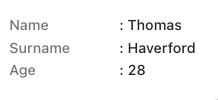 <table><thead><tr><th width="77">id</th><th>name</th><th>surname</th><th width="148">age</th></tr></thead><tbody><tr><td>1</td><td>Thomas</td><td>Haverford</td><td>28</td></tr><tr><td>2</td><td>Leslie</td><td>Knope</td><td>32</td></tr><tr><td>3</td><td>Ronald</td><td>Swanson</td><td>48</td></tr></tbody></table>