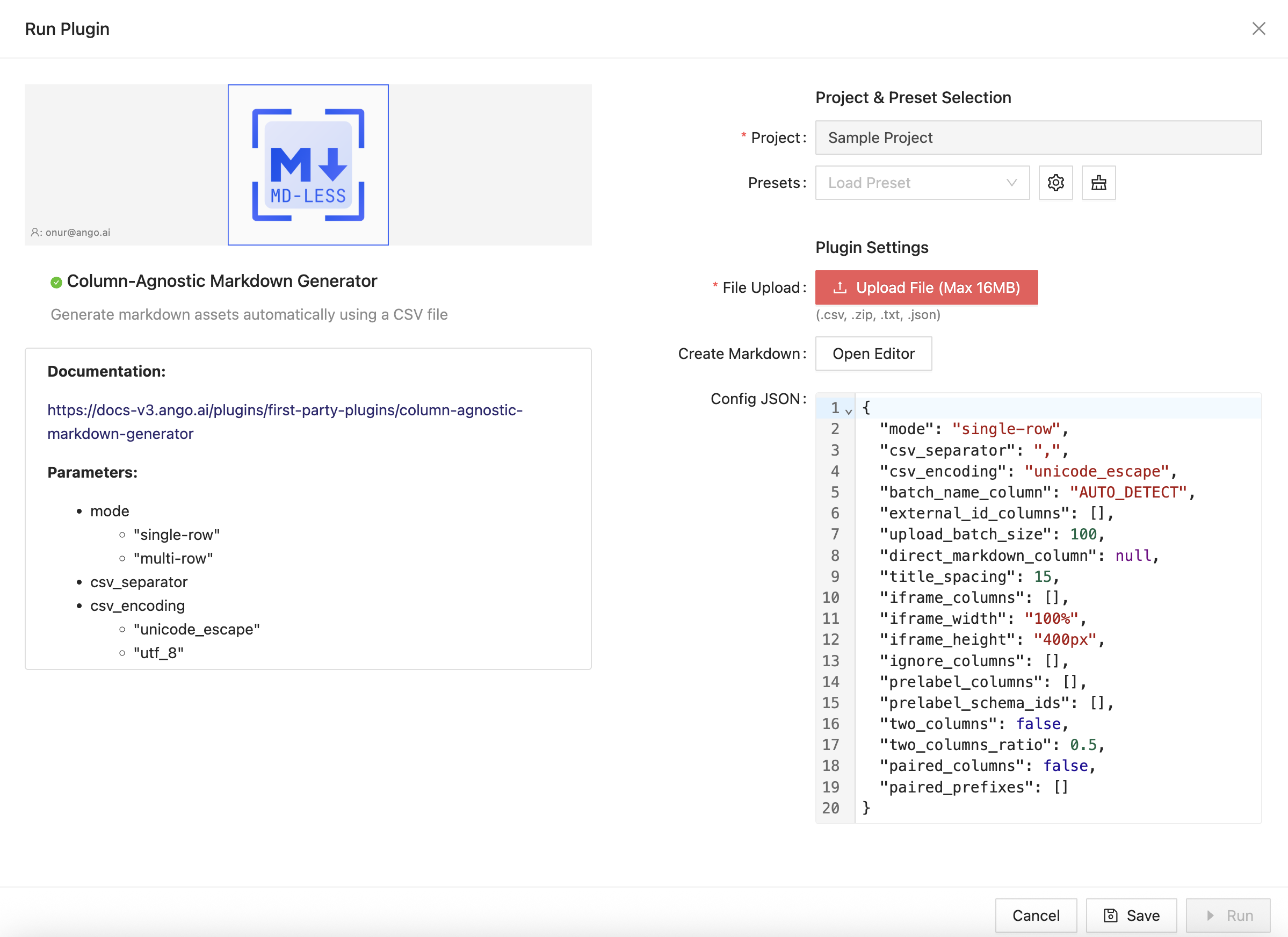 The Column-Agnostic Markdown Generator is a plugin made, published, and officially supported by Ango AI that allows you to create Markdown assets from a CSV table.