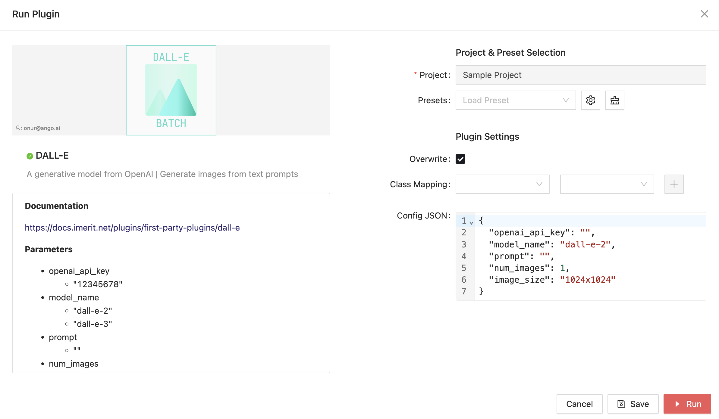 **openai\_api\_key**: By `default`, the DALL-E plugin will use an OpenAI API key provided by iMerit, for testing purposes, limited to generating, globally, 5 images per minute. You may provide here your own OpenAI API key to remove these limits and utilize your own OpenAI API key.