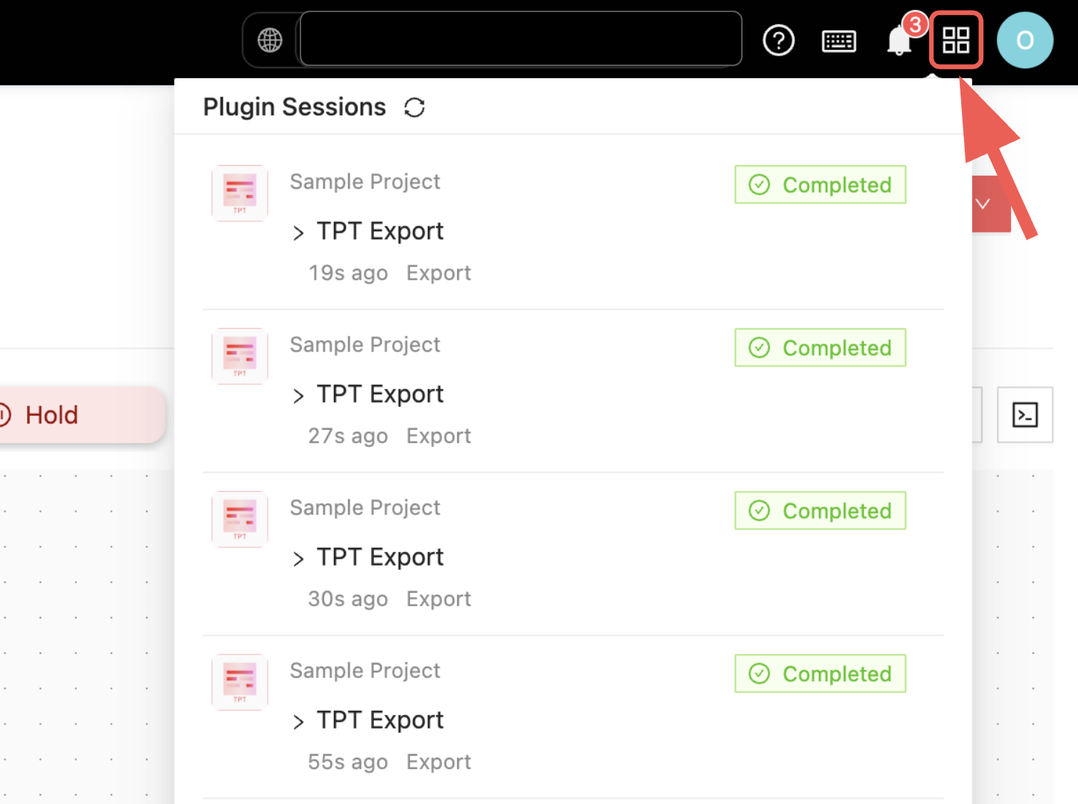 Whenever a new session is created, it is added to the *Plugin Sessions* dialog, which you can access by clicking on the "four squares" icon in the top-right corner of Ango Hub: